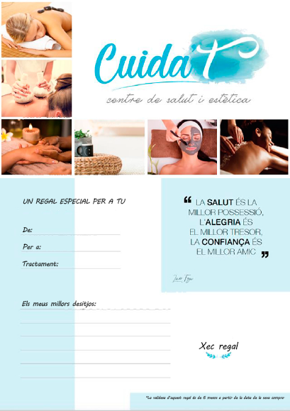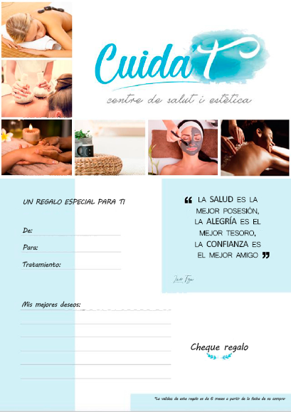 En esta página puedes descargar el bono, o cheque, regalo tras realizar tu compra en la tienda. Imprímelo y rellénalo con los datos del tratamiento y de la persona a quien quieras sorprender con un fabuloso regalo en salud y belleza. También puedes dejarle tu mensaje y tus deseos para cuando venga a disfrutar del tratamiento a nuestro centro.